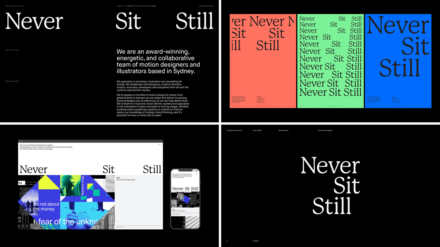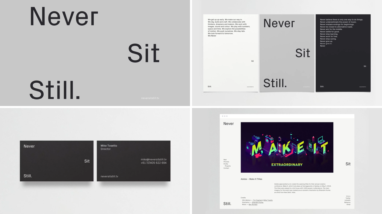I left my full time role as Motion Director for Interbrand Australia in October 2014 to pursue my own venture. Never Sit Still was officially registered in August 2016 with a very small payroll of two employees, one of them being me.